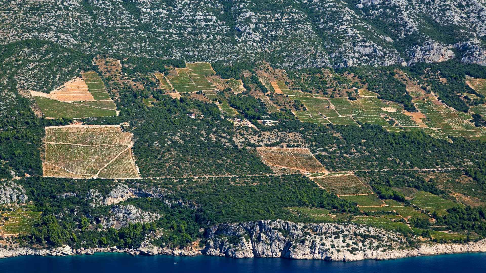 Pelješac has nearly ideal natural conditions for growing grapes. The vineyards are planted on steep, rocky slopes that face directly south, soaking up sunlight from morning until evening. The sea reflects additional light onto the vines, while limestone-rich soil forces roots to dig deep for nutrients.
